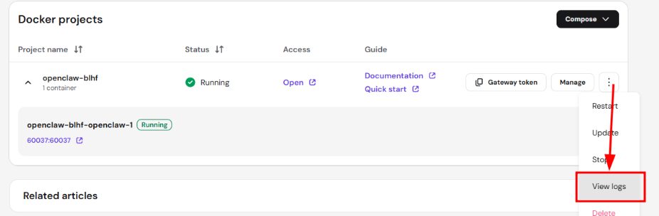 - Find your OpenClaw container and click the three-dot menu.
