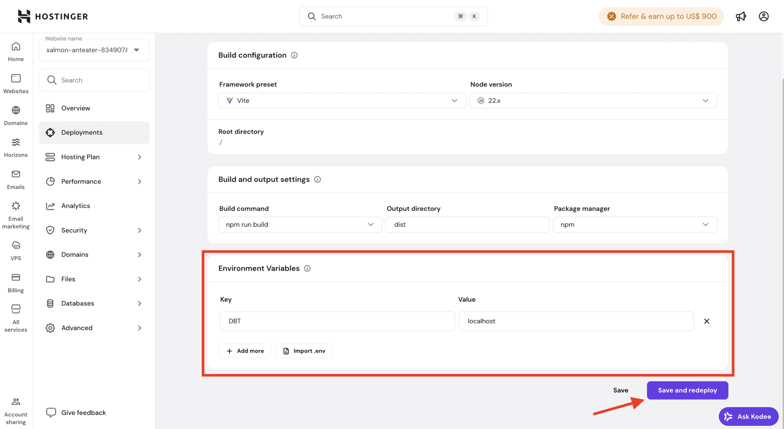 Update or add environment variables for your Node.js application after deployment on Hostinger