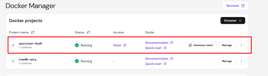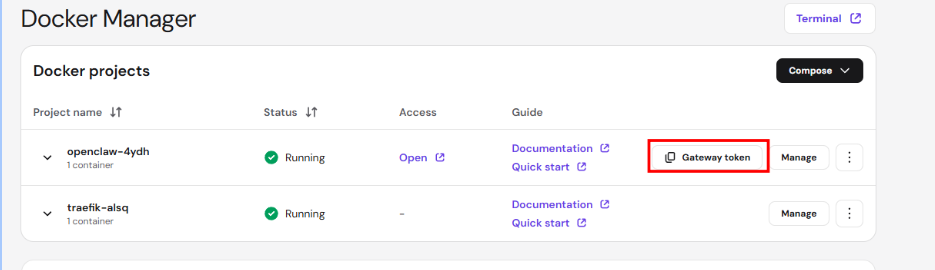 OpenClaw uses a gateway token for authentication. You can copy it directly from Docker Manager.