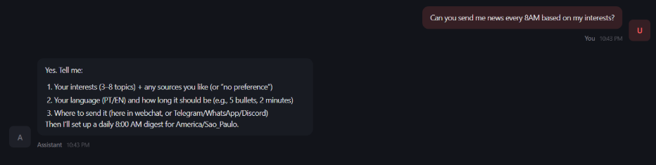 Answer each question, and OpenClaw automatically creates the scheduled task. You will receive your first digest at the time you specified.