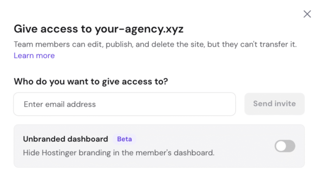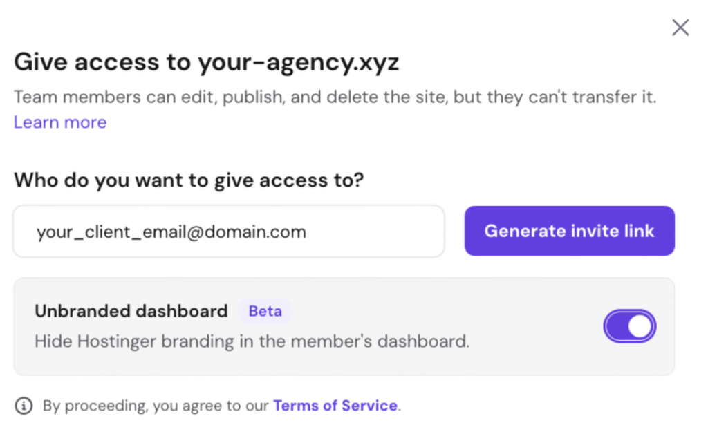Step 3 – Before sending the invite, locate the Unbranded dashboard toggle at the bottom of the modal. Enable it by switching it on — the toggle will turn purple when active. This setting ensures that when your client logs in, they will see a dashboard with no Hostinger branding.