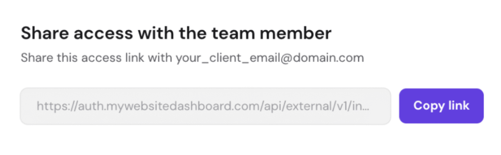 Step 4 – Click Copy link and send it directly to your client. They will use this link to log in and access their site dashboard. Their email will be pre-filled, they will only need to create a password for logging in.