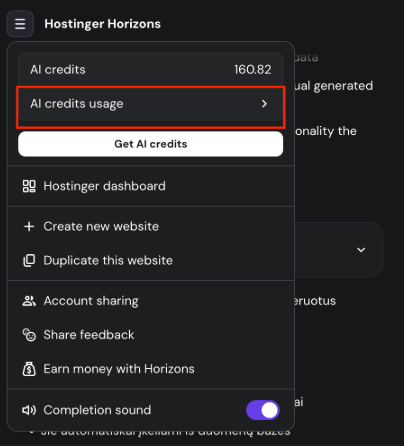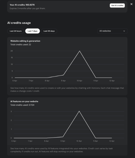 - 1 message = 1 AI credit (for website creation and editing in Horizons)