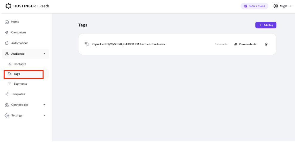 Tags in Hostinger Reach help you organize your contacts and make audience segmentation more flexible and powerful. By assigning tags to contacts, you can later use them to build targeted segments and send more relevant campaigns.