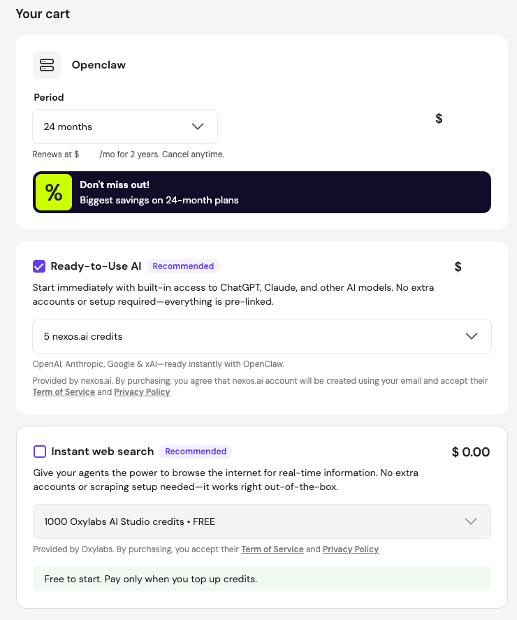 - Scroll down and click on Get OpenClaw. There is only one version for 1-Click OpenClaw. After selecting this option, you will be directed to the cart to proceed with payment.