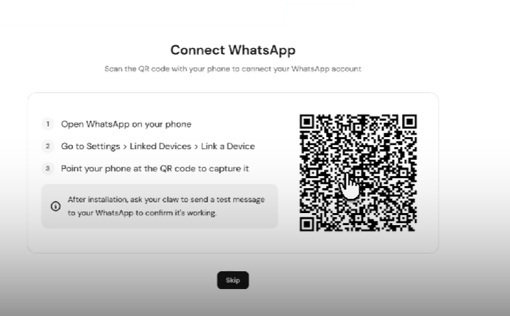 - WhatsApp: Follow the QR code pairing steps shown in hPanel. Open WhatsApp on your phone → Settings → Linked Devices → Link a Device → scan the QR code displayed on screen.
