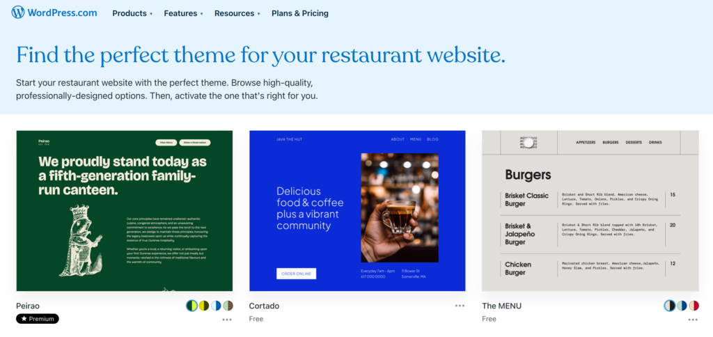 WordPress.com is renowned for its flexibility and content management capabilities, making it a top choice for creating content-rich restaurant websites. It’s ideal for owners who want to combine their site with a blog, photo galleries, or an online menu.