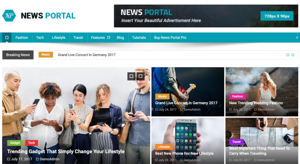 News Portal is an SEO-friendly theme with magazine, news, and blogger layouts and custom widgets. It includes built-in pagination and breadcrumbs to help search bots skim through pages faster, improving rankings.