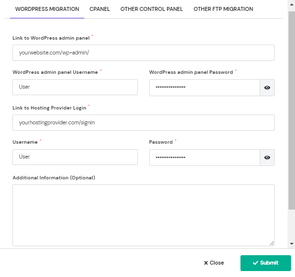 Besides that, you will need the link to your previous hosting provider’s login page and the username and password to access your old hosting account.