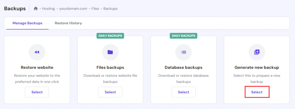 4. Under Generate new backup, click Select, and then Proceed. The process may take up to a few hours, depending on the amount of website data.