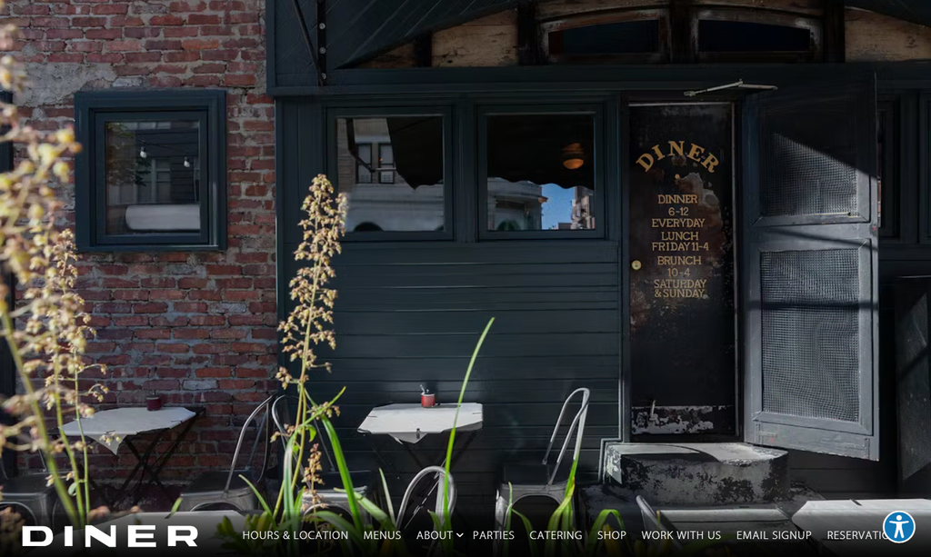 Diner offers another simple restaurant website design inspiration. Its homepage employs a bottom navigation bar, setting it apart from other dining establishment websites.
