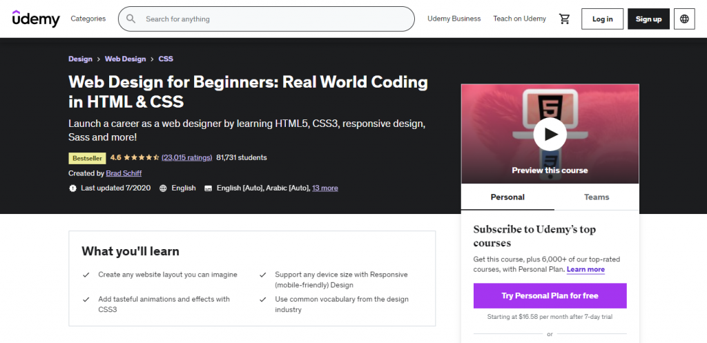- Best premium program – Web Design for Beginners: Real World Coding in HTML and CSS by Udemy.