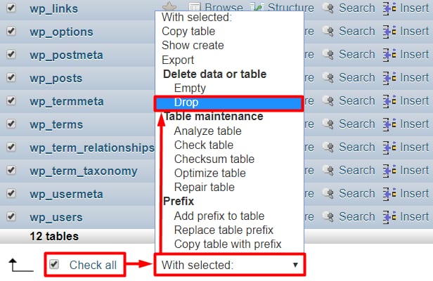 Якщо Ви хочете видалити таблиці з бази даних, наприклад, перед імпортом нової резервної копії бази даних, виконайте такі дії: