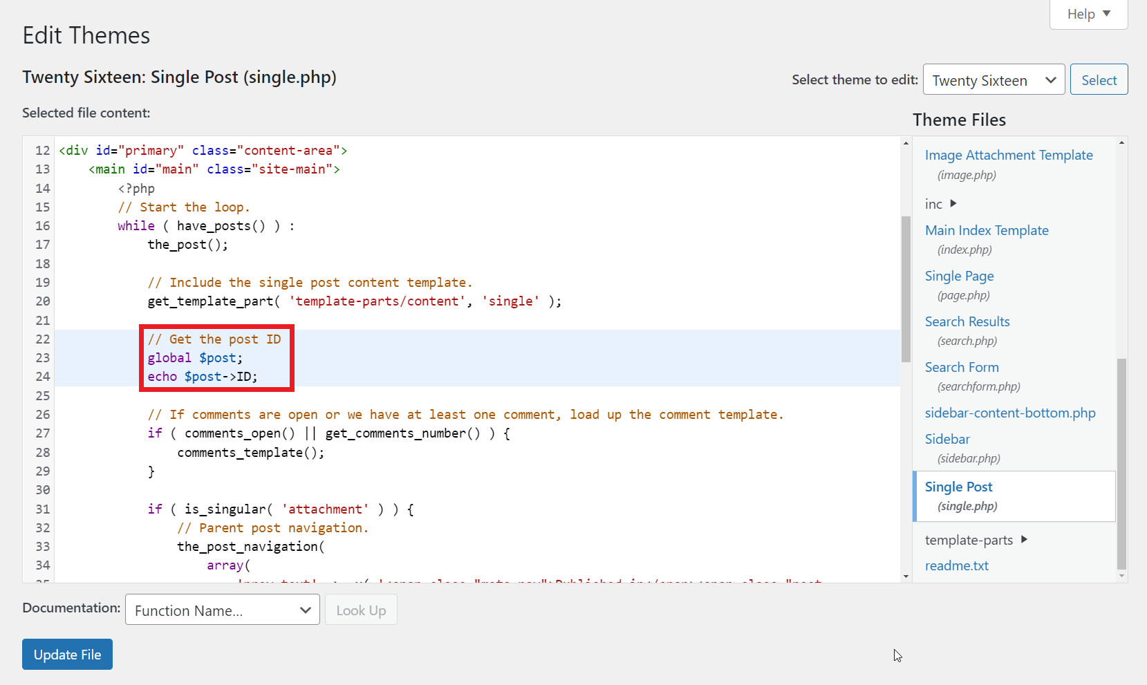 - Go to the Theme Files tab -> single.php.