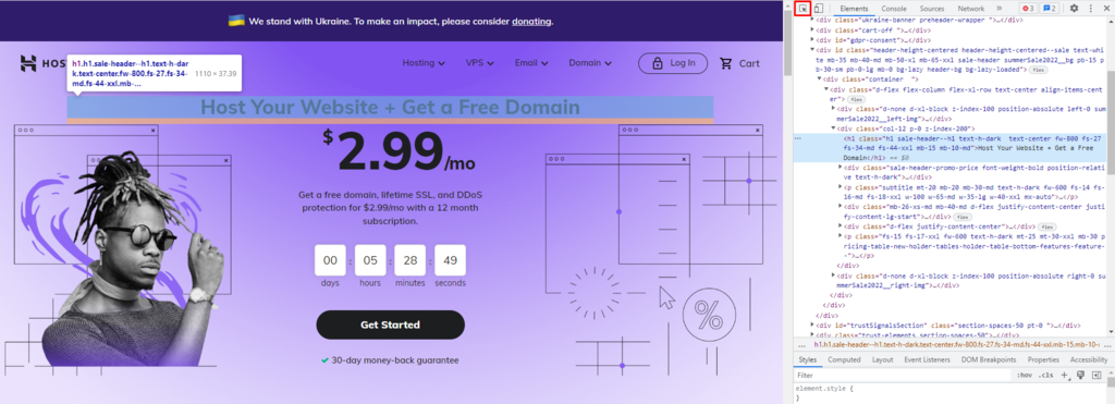 - After opening the Elements box, use the Inspect tool ‒ the cursor icon at the top left of the panel ‒ to highlight the source code element you want to change.