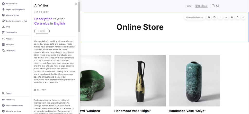 This tool is useful for creating quick yet unique product descriptions for your store or brainstorming ideas. We’ll cover this website builder more in a later section.