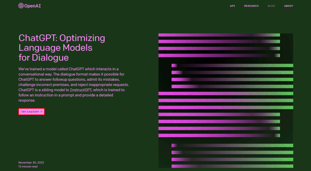 Visit ChatGPT’s page and click Try ChatGPT to log in or create a new account. You can also get some information about this tool, including its training method, limitations, and examples of use cases.