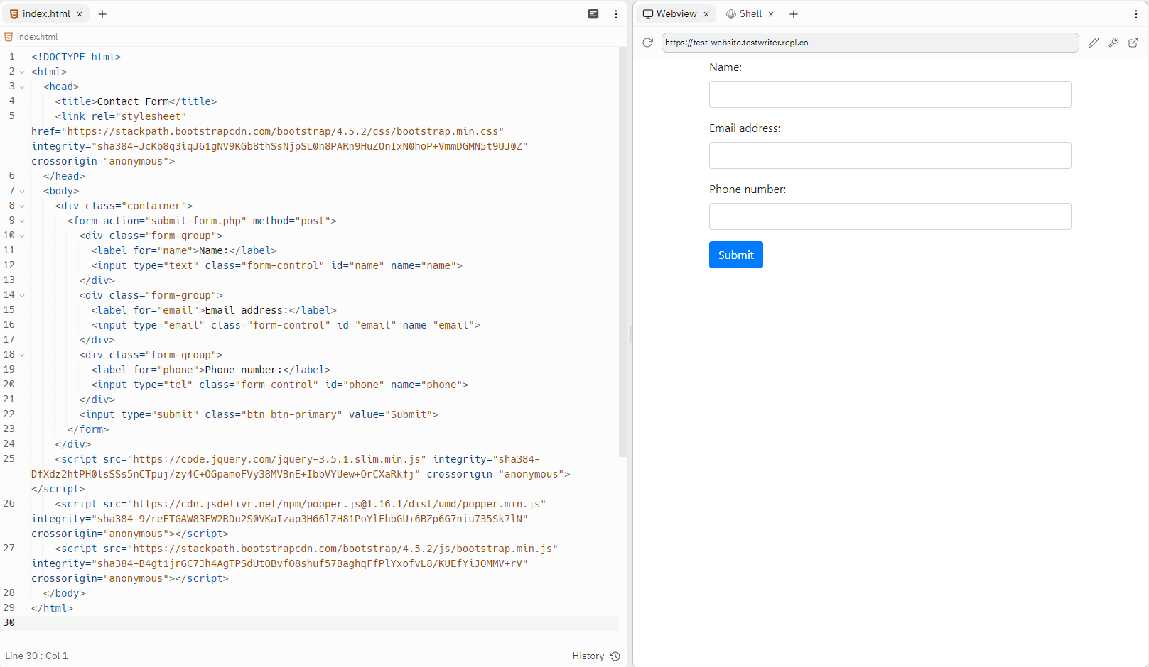 </html>Note that this code also uses Bootstrap, even though we didn’t specify it on the prompt. To make sure the code works, we have tested it using Replit: