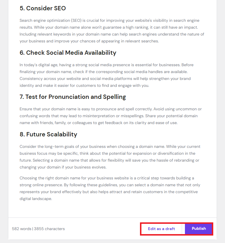 Select Edit as a draft at the bottom of the page to review and tweak the blog article. Otherwise, you can click Publish to post it on your website immediately or scroll up and select Create content again if you want a different result.