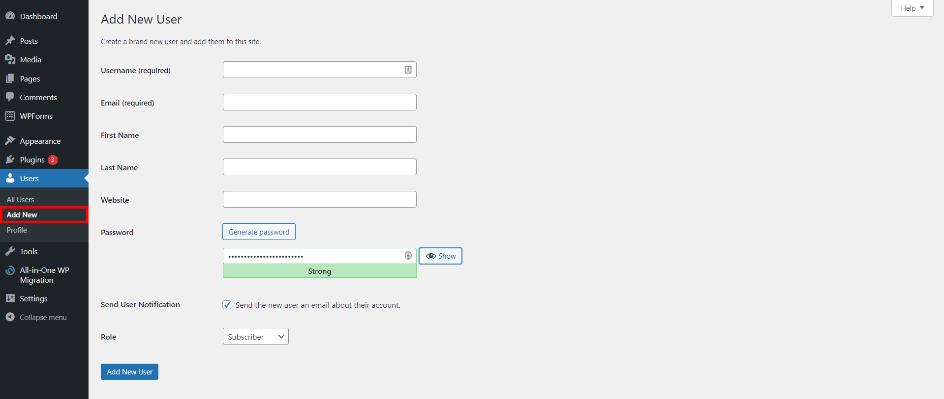 - Login to the WordPress dashboard and navigate to the Users section, Add New tab.
