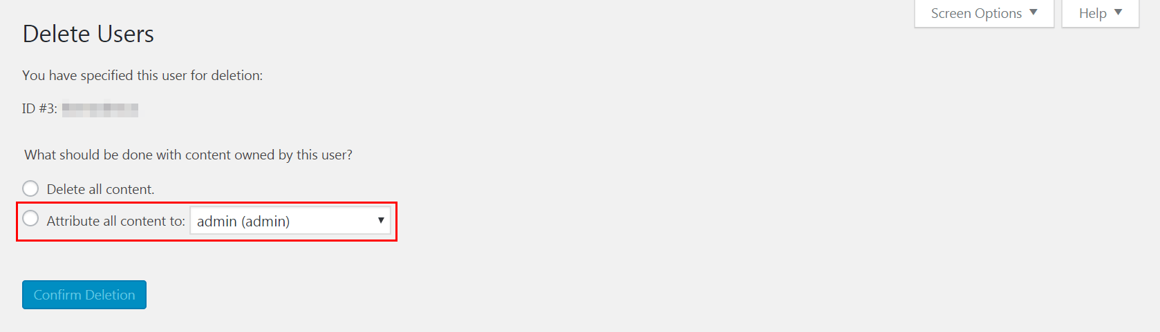 - Select Attribute all content to, and choose your new admin account from the drop-down menu.