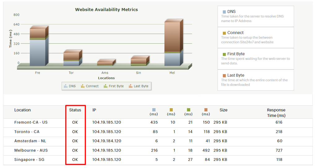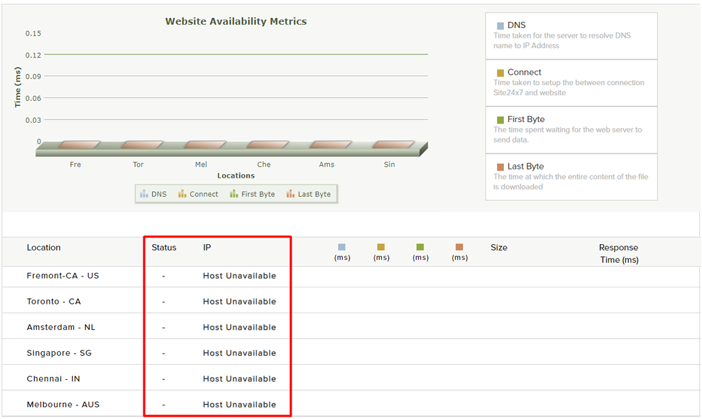 Aside from checking your site online status, this website checker also gives you clear information on the total response time, the time to resolve DNS and to connect, plus the first-byte and last-byte time
