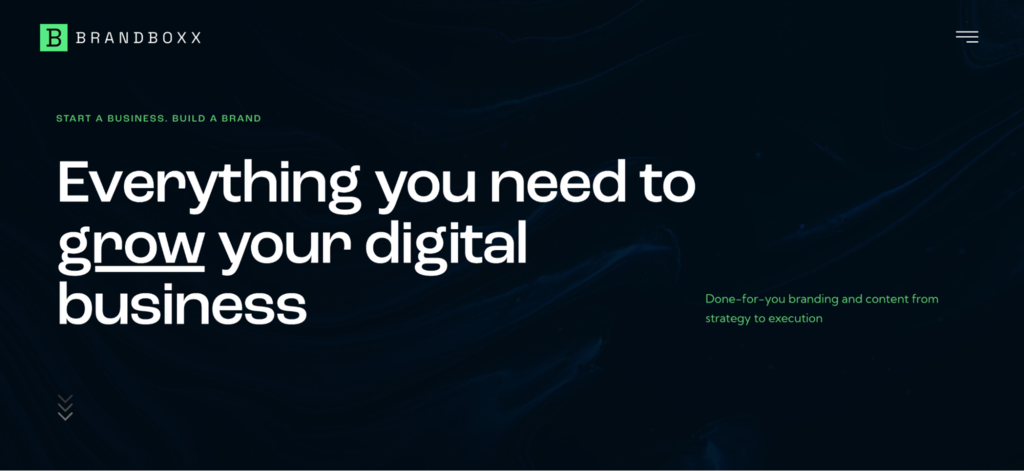 Brandboxx’s marketing portfolio stands out for its focus on creating distinctive brands. The minimalist black-and-white homepage showcases the agency’s expertise in branding, website design, and content creation.