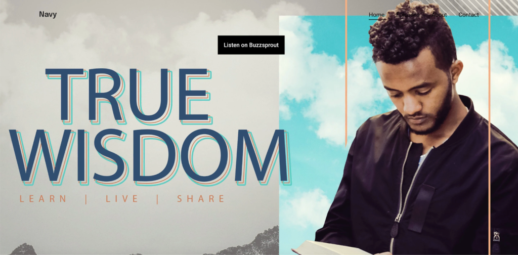 The website’s design is simple and user-friendly, with clear sections like Episodes, About, and Contact for easy navigation. The hero section emphasizes visual hierarchy, showcasing the podcast title and the host’s image. It includes a prominent call-to-action (CTA) guiding new listeners to their podcast episodes on Buzzsprout.