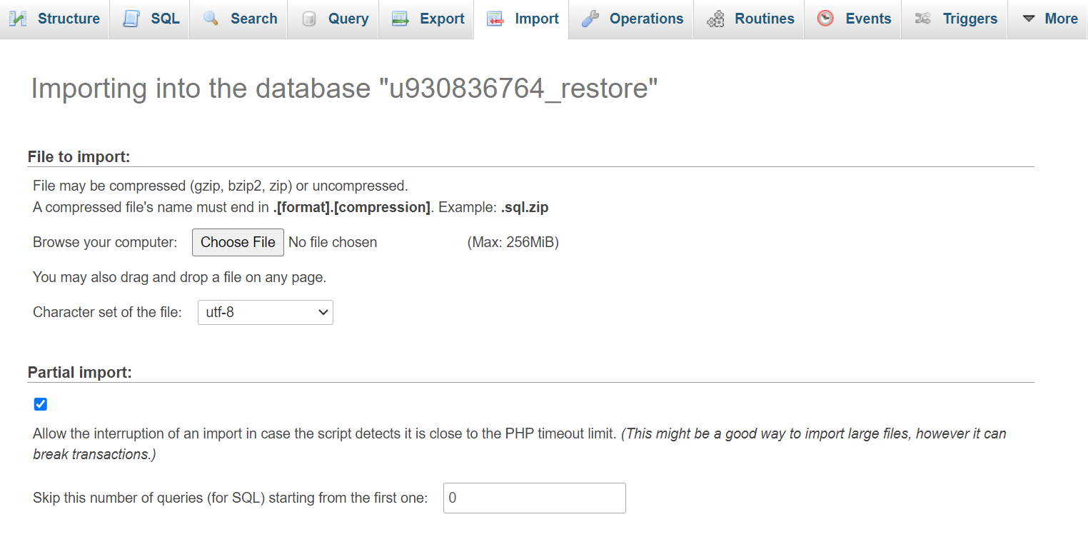 Important! Your database backup file should be less than 256 MB. It’s the maximum size for file uploads in phpMyAdmin.