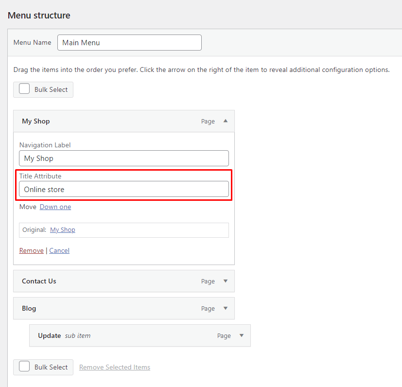 - Type additional information for that specific menu item into the title attribute text box. Repeat the steps for other menu items if needed.