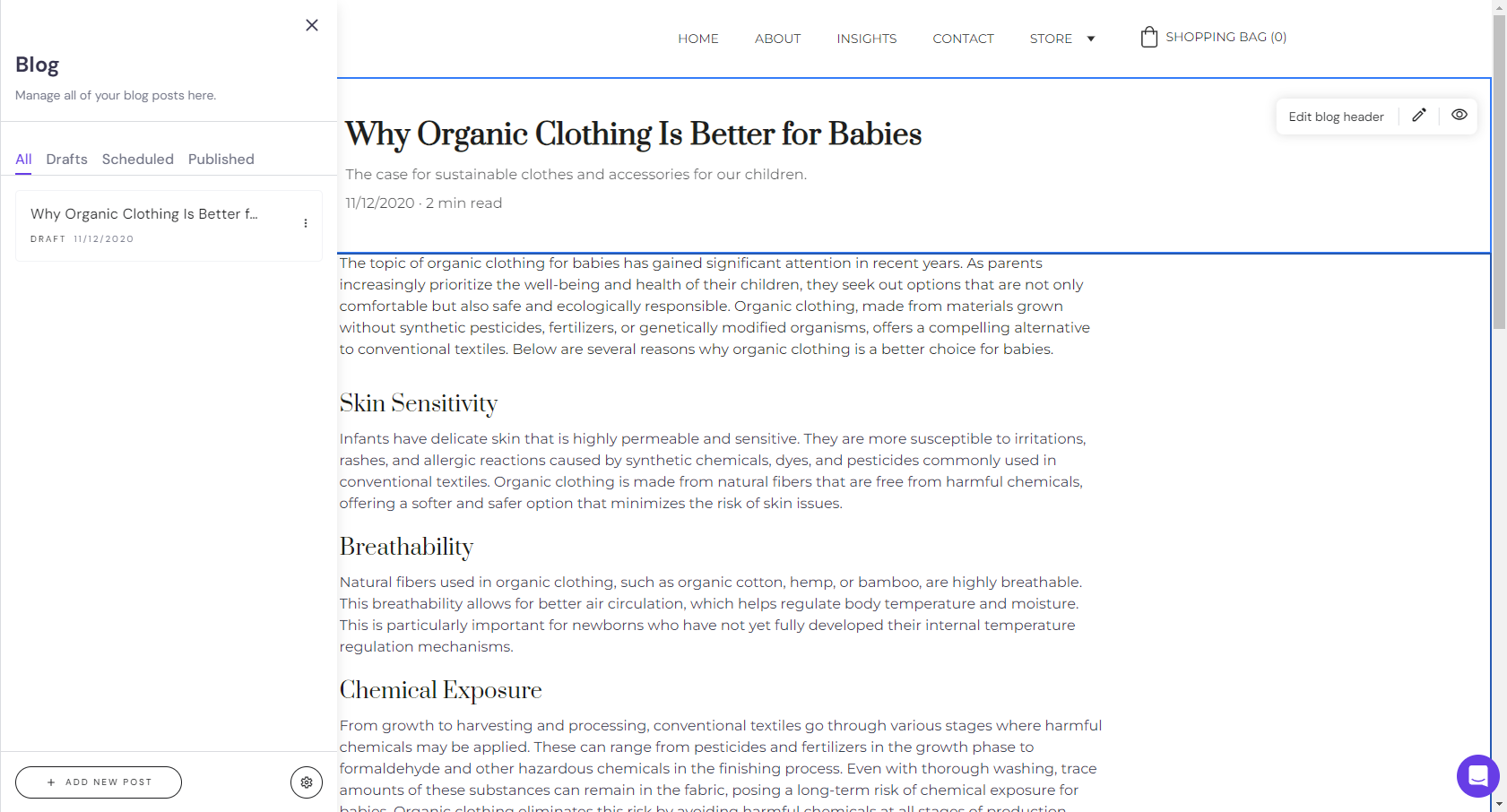 Other than that, the integrated blogging tools make it easy to create drafts, schedule posts, and adjust SEO settings like URLs and meta descriptions. All of this is accessible from the drag-and-drop builder to streamline your workflow.