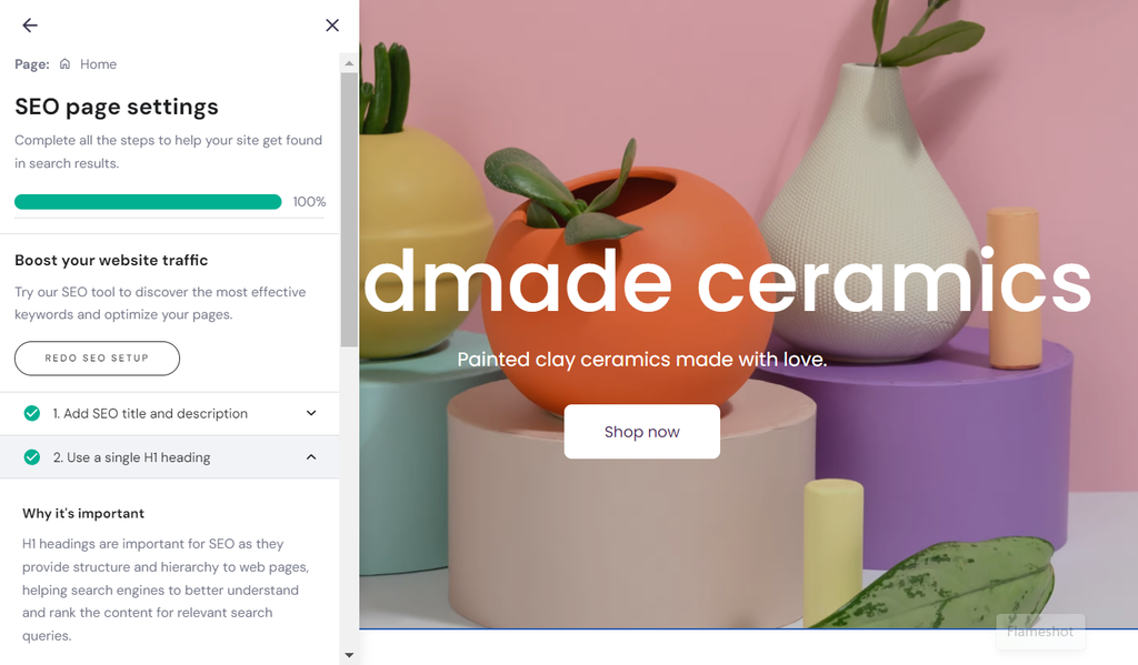 For meta titles and descriptions, the builder helps by suggesting keywords and automatically creating metadata based on existing website information.