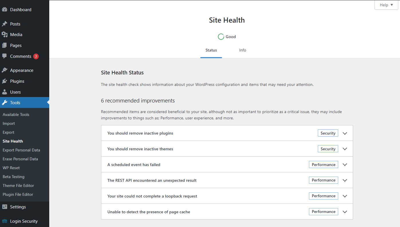 Within the Tools section of your WordPress admin area is a quick way to check on your site’s condition, which is divided into two parts.